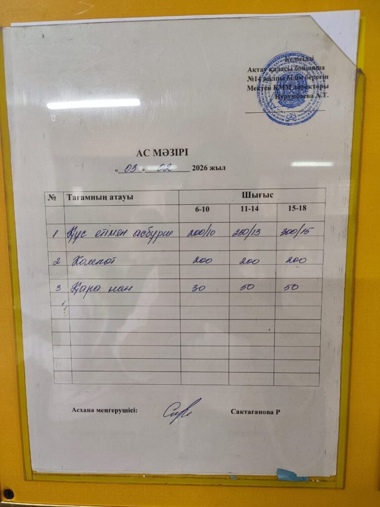 Ас мәзірі 03.02.26 Бағасы әр балаға 600 теңге