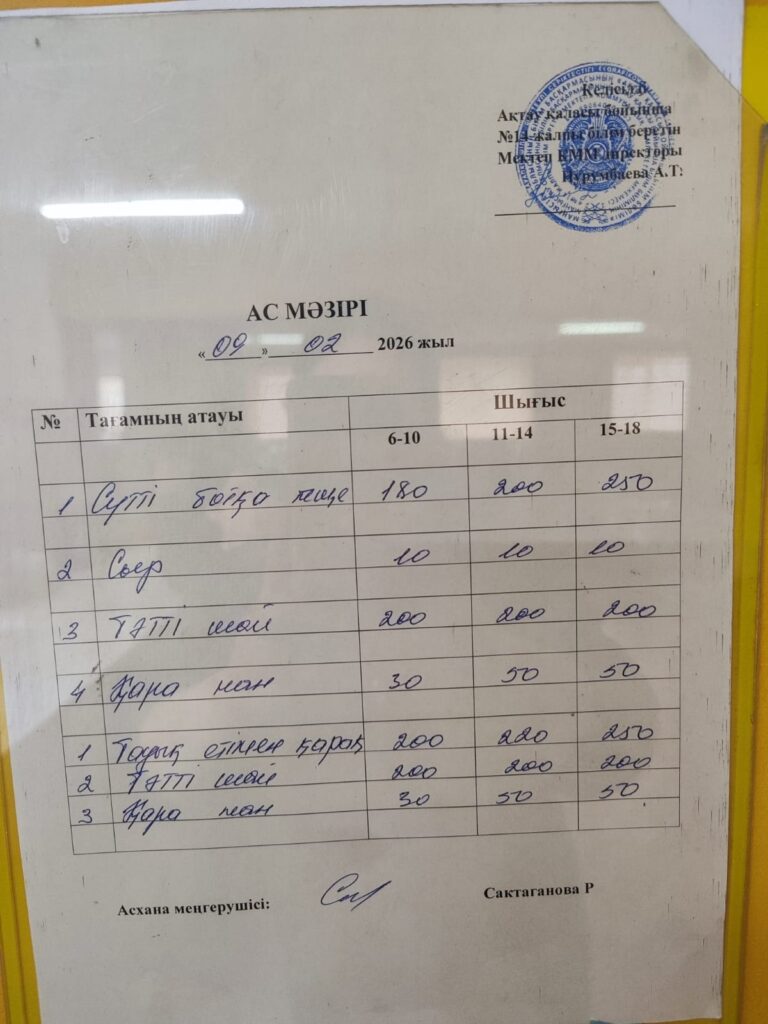 Ас мәзірі 09.02.26 Бағасы 1 балаға 600 теңге