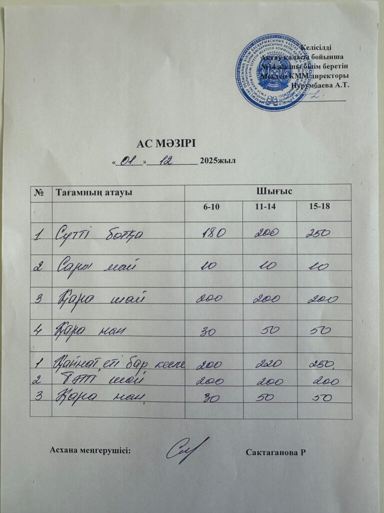 Ас мәзірі 1.12.25 Бағасы әр балаға 600 теңгеDecember 1, 2025December 3, 2025 Leave a Reply Cancel replyYou must be logged in to post a comment.