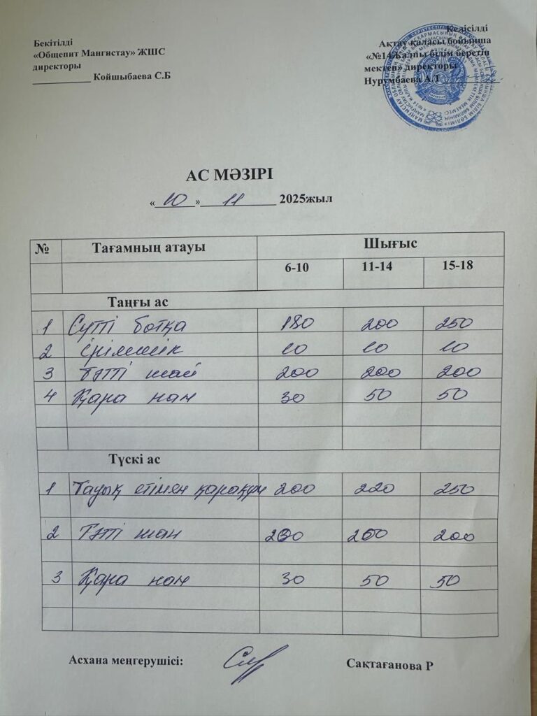Ас мәзірі 10.11.2025 Бағасы әр балаға 600 теңге