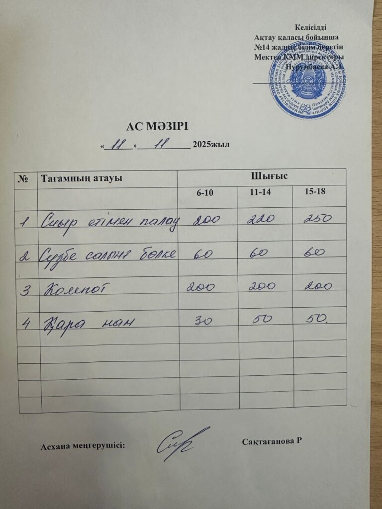 Ас мәзірі 11.11.2025 Бағасы әр балаға 600 теңге