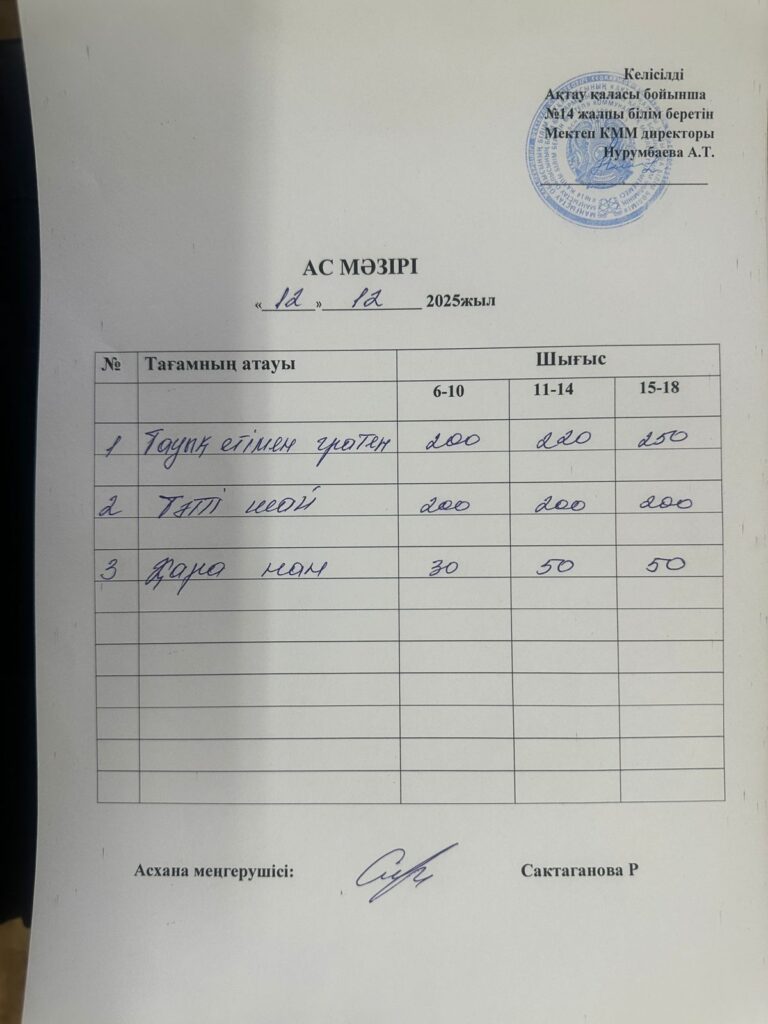 Ас мәзірі 12.12.25 Бағасы әр балаға 600 теңгеDecember 12, 2025December 22, 2025 Leave a Reply Cancel replyYou must be logged in to post a comment.