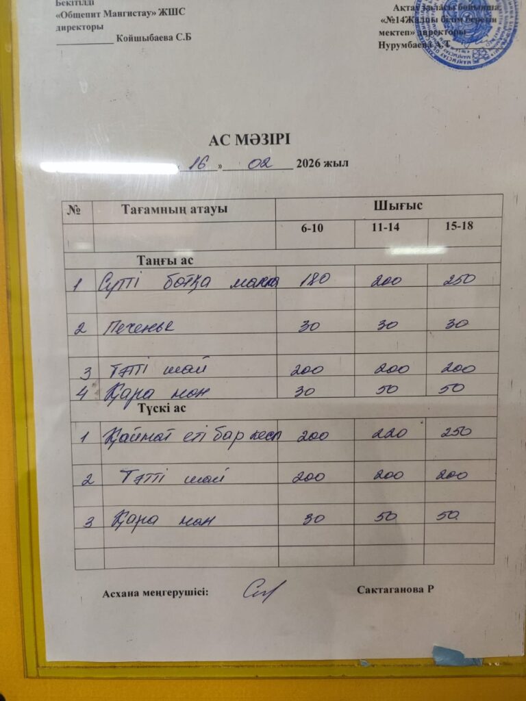 Ас мәзірі 16.02.26 Бағасы әр балаға 600 теңге