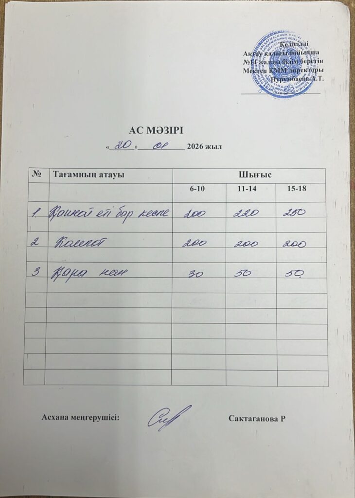 Ас мәзірі 20.01.26 Бағасы әр балаға 600 теңге