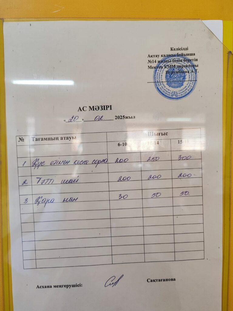 Ас мәзірі 20.02.26 Бағасы әр балаға 600 теңге
