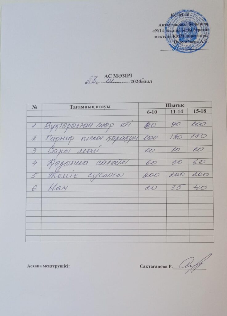 Ас мәзірі 28.01.2025 Бағасы әр балаға 600 теңге