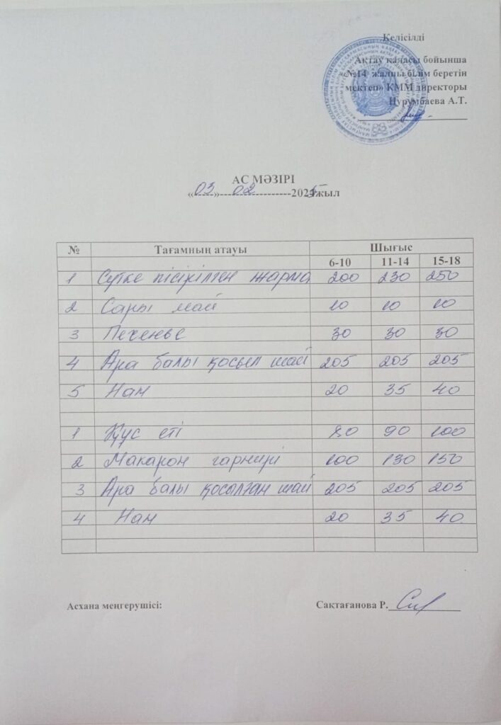 Ас мәзірі 3.02.2025 Бағасы әр балаға 600 теңге