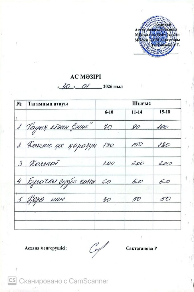 Ас мәзірі 30.02.26 Бағасы әр балаға 600 теңге