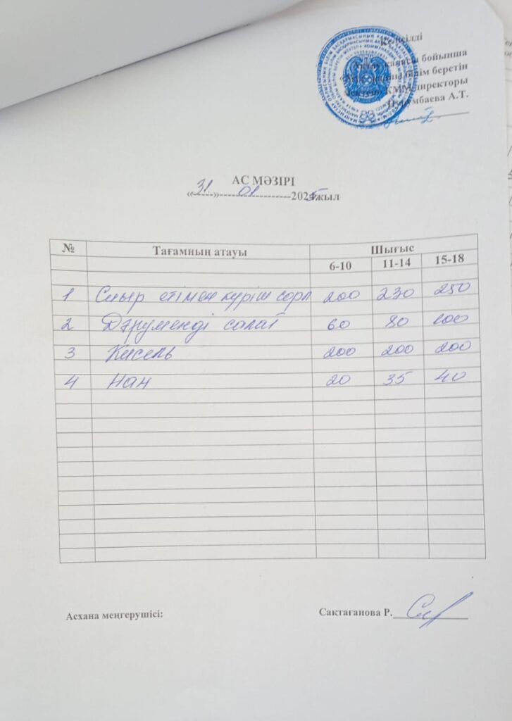 Ас мәзірі 31.01.25 Бағасы әр балаға 600 теңге