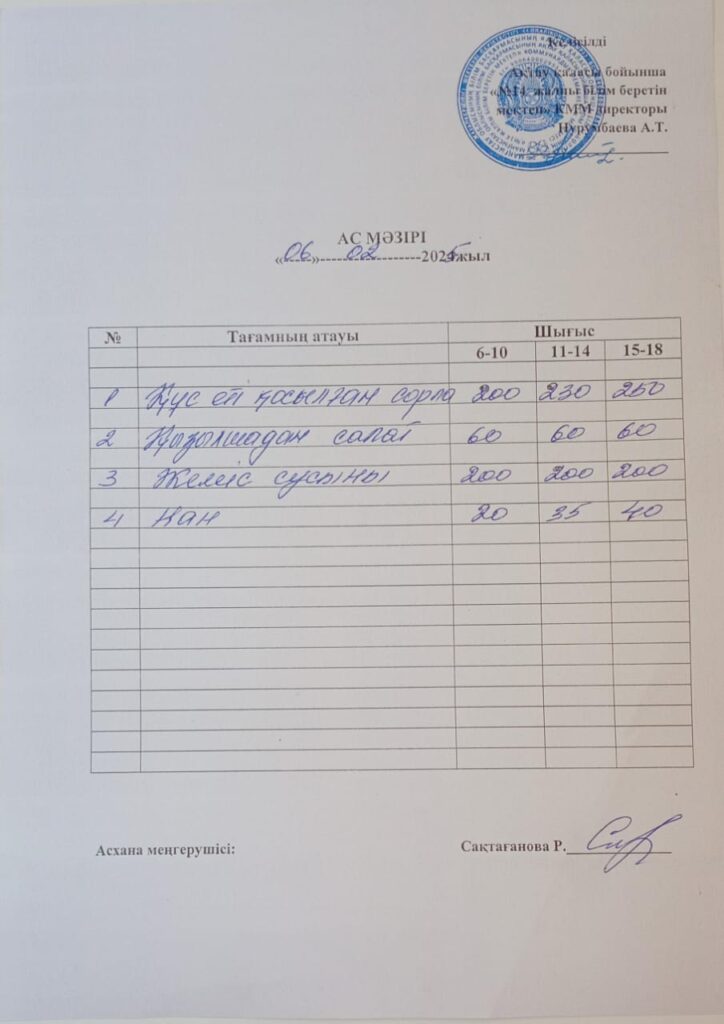 Ас мәзірі 6.02.2025 Бағасы әр балаға 600 теңге