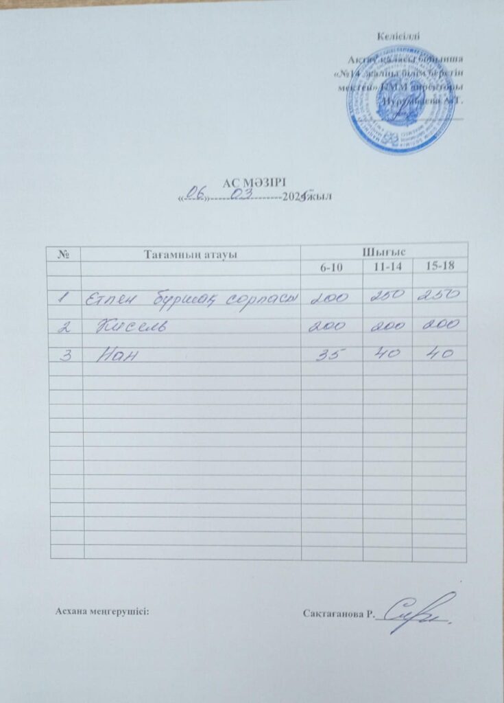 Ас мәзірі 6.03.25 Бағасы 600 теңге