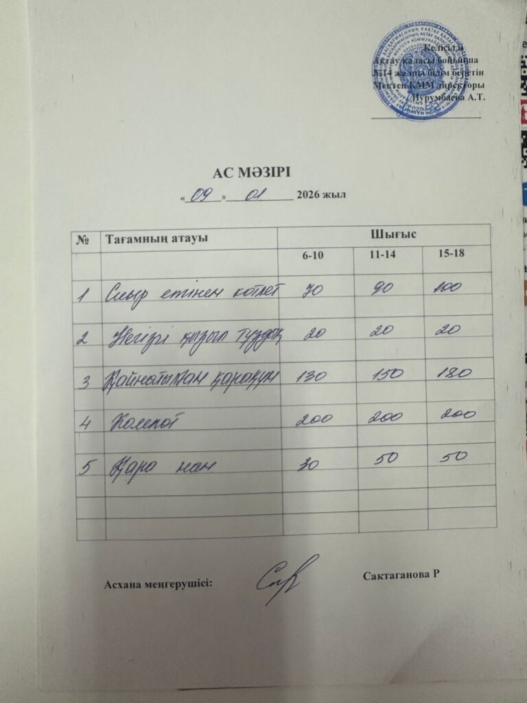 Ас мәзірі 9.01.26 Бағасы әр балаға 600 теңге